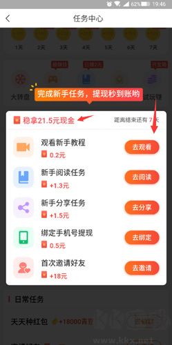 在任務(wù)中心中,注冊的新用戶會有額外的新手任務(wù)??梢宰屛覀兎€(wěn)拿21.5現(xiàn)金獎勵。