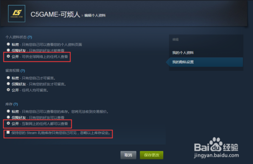 個(gè)人資料點(diǎn)擊公開,庫存設(shè)置點(diǎn)擊公開,最下面保持您的steam禮物庫只有自己可見,忽略以上庫存設(shè)定。這個(gè)不要勾選!然后點(diǎn)擊保存按鈕即可。