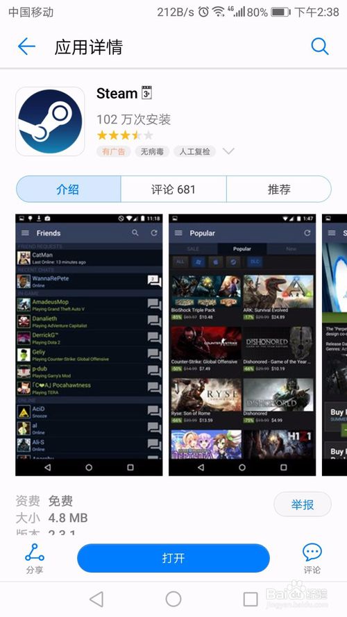 最重要的一步來了!就是下載steam手機(jī)令牌!steam規(guī)定和第三方交易要有手機(jī)令牌的哦!首先應(yīng)用市場搜索steam,下載并安裝。