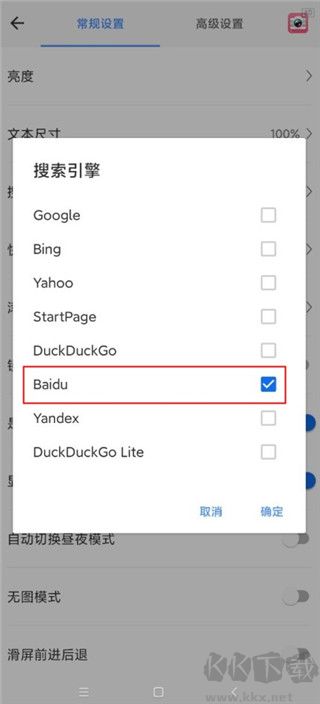 3、找到搜索引擎一欄,將google改為baidu,默認搜索引擎就從谷歌變成了百度,就可以在國內(nèi)使用了
