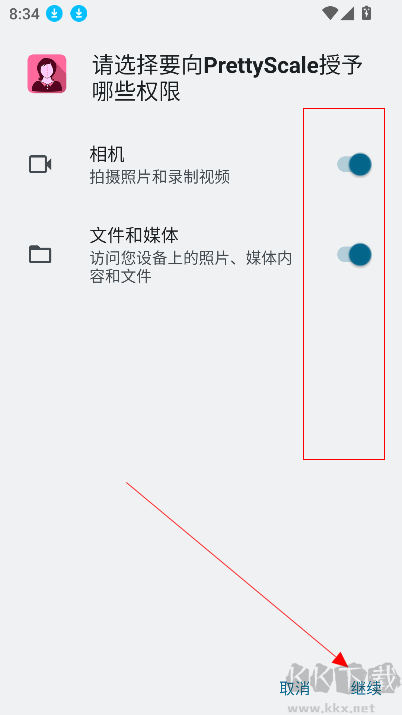 在kk下載站下載安裝prettyscale官方中文版,勾選授權(quán),點(diǎn)擊繼續(xù)進(jìn)入