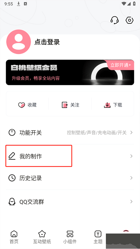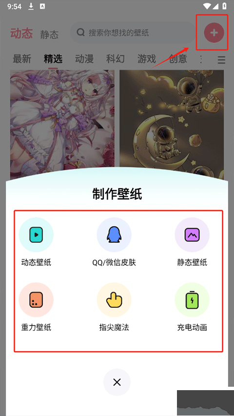 1、在app首頁內點擊右上角+號,并選擇你要制作的壁紙類型,例如靜態(tài)壁紙