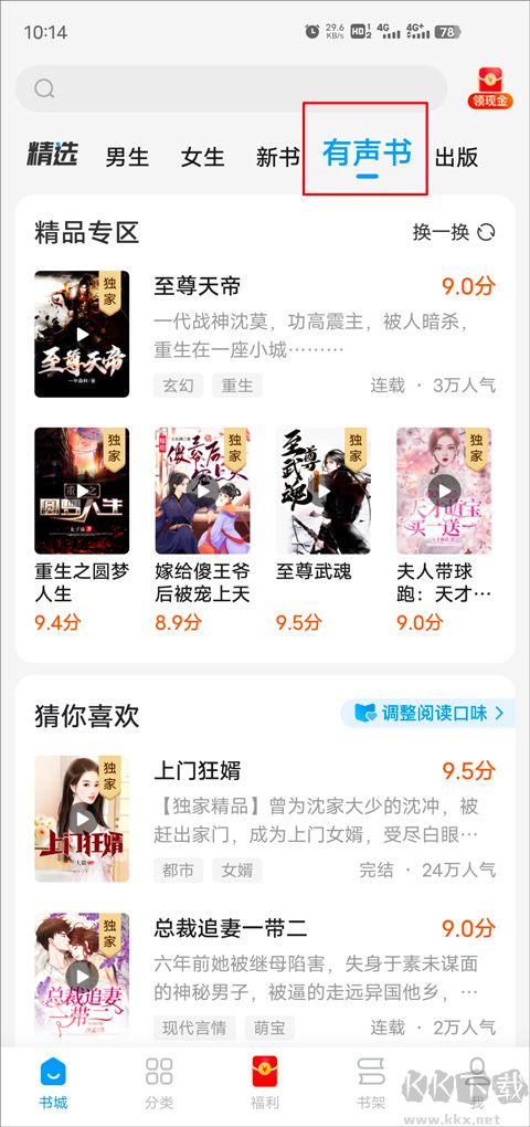1、打開進(jìn)入后,在【書城】點擊【有聲書】,然后找到一本想看的小說