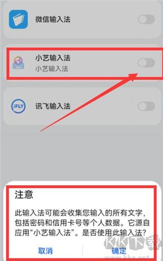 3、不用理會,直接點擊“確定”,然后在下圖中,選擇“小藝輸入法”,把它設(shè)置成默認(rèn)輸入法(我信也可以在手機設(shè)置的“系統(tǒng)和更新”里的“語言和輸入法”里設(shè)置它為默認(rèn))。