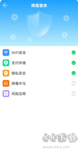 2. 點(diǎn)擊“病毒查殺按鈕,等待應(yīng)用智能識(shí)別并查殺手機(jī)中的病毒文件。