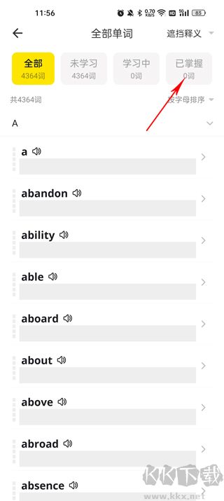 2、進(jìn)入全部單詞頁(yè)面,切換到已掌握欄目,點(diǎn)擊選詞重學(xué),選擇單詞,最后點(diǎn)擊重新學(xué)習(xí)即可。