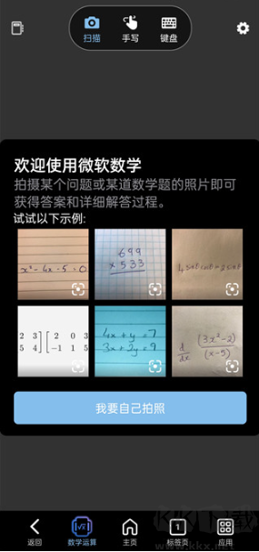 1、啟動(dòng)微軟數(shù)學(xué),選取數(shù)學(xué)運(yùn)算菜單,將待解題目標(biāo)拍攝錄入,點(diǎn)擊拍攝功能鍵。