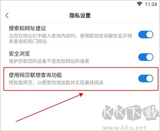 5、在“隱私設置”屏幕里點選“啟用網(wǎng)頁聯(lián)想查詢特性”區(qū)域。