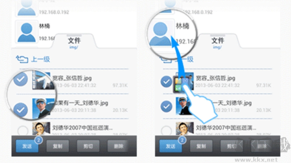 2、傳輸方式二選一,你可以勾選單個(gè)/多個(gè)文件,拖拽至聯(lián)系人頭像釋放