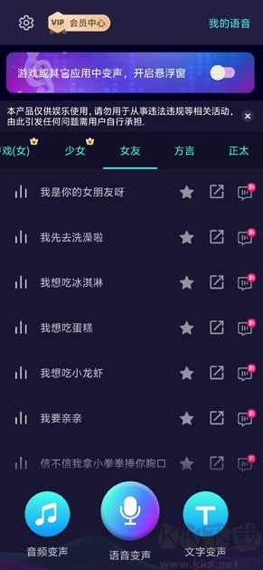 3、多元語(yǔ)音資源庫(kù):集成豐富真人語(yǔ)音素材,增強(qiáng)游戲社交趣味性,適配熱門(mén)游戲、日常對(duì)話(huà)及音樂(lè)演繹場(chǎng)景