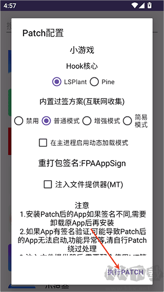 9、在主畫面輕觸右下角添加圖示,將需注入組件的應(yīng)用與模塊導入后打包簽名。