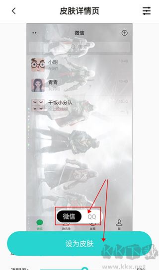 同樣在壁紙界面,點(diǎn)擊下方的應(yīng)用皮膚即可開始設(shè)置,可以選擇設(shè)置微信皮膚還是QQ皮膚,選擇完之后可以點(diǎn)擊下方的“設(shè)為皮膚”就可以完成應(yīng)用皮膚的設(shè)置啦。