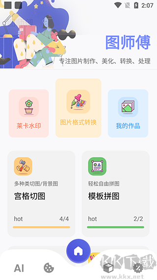 1、打開(kāi)軟件來(lái)到首頁(yè),可以看到有圖片格式轉(zhuǎn)換、宮格切圖等功能,可以根據(jù)需要自由選擇使用。