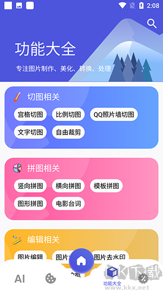 4、點(diǎn)擊功能大全,可以看到有切圖相關(guān)、拼圖相關(guān)和編輯相關(guān)的功能可以使用。