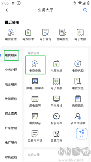 2、找到“電費(fèi)服務(wù)”欄目,點(diǎn)擊“電費(fèi)查繳”