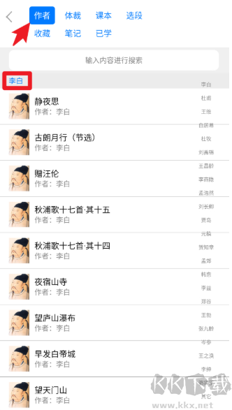 3、支持按“作者”檢索,如輸入“李白”,便可瀏覽其全部作品;
