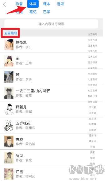 4、也可按“體裁”篩選,如選擇“五言絕句”,迅速找到對應類型古詩;