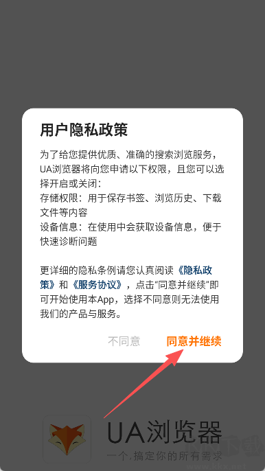 1、在手機(jī)上啟動(dòng)UA瀏覽器應(yīng)用,同意相關(guān)用戶協(xié)議;