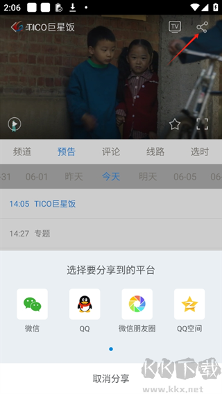 2、點(diǎn)擊播放頁(yè)面,左上角的分享按鈕可以選擇分享到哪些平臺(tái)。