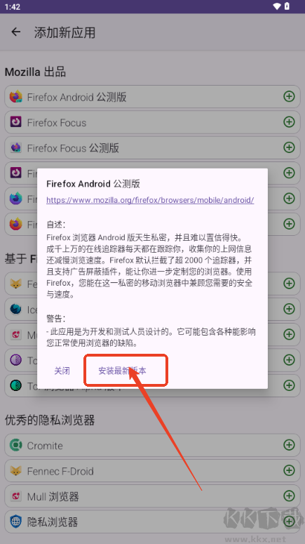 FFUpdater是一款專用于更新Firefox瀏覽器的移動(dòng)端工具,可以幫我們免去手動(dòng)檢查更新的麻煩,應(yīng)用內(nèi)不僅匯集多種版本的Firefox,還提供其他優(yōu)質(zhì)瀏覽器的安裝包,我們不需要逐一訪問官網(wǎng)就可以便捷獲取。FFUpdater還具備自動(dòng)版本檢測(cè)功能,可以及時(shí)提醒用戶Firefox的新版本發(fā)布信息。