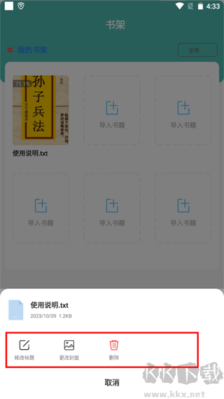 針對(duì)導(dǎo)入的圖書可進(jìn)行快捷編輯,通過長按可進(jìn)行標(biāo)題、封面圖等元素自定義修改