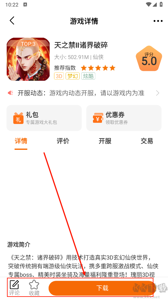 3、在感興趣的游戲詳情頁中,可查閱禮包詳情、用戶評價,或直接收藏游戲。點擊“下載”即可安裝并開始體驗。