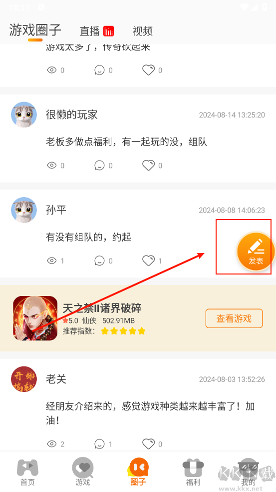 5、通過“圈子”功能可與其他玩家交流,點擊右側“發(fā)表”按鈕即可分享個人游戲心得與看法。