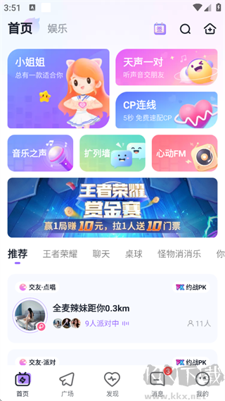 匯聚多樣社交與娛樂(lè)功能入口,還有推薦直播語(yǔ)音房等內(nèi)容。