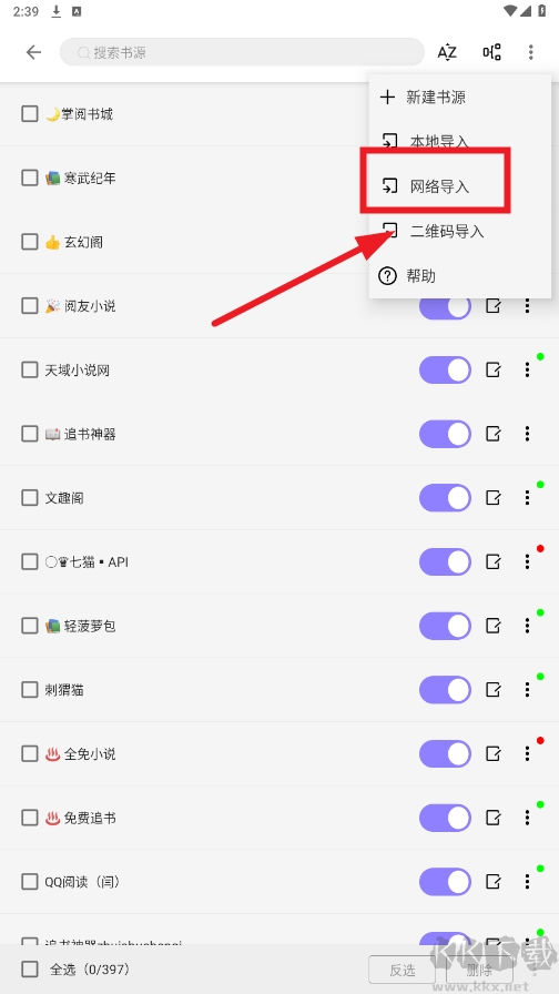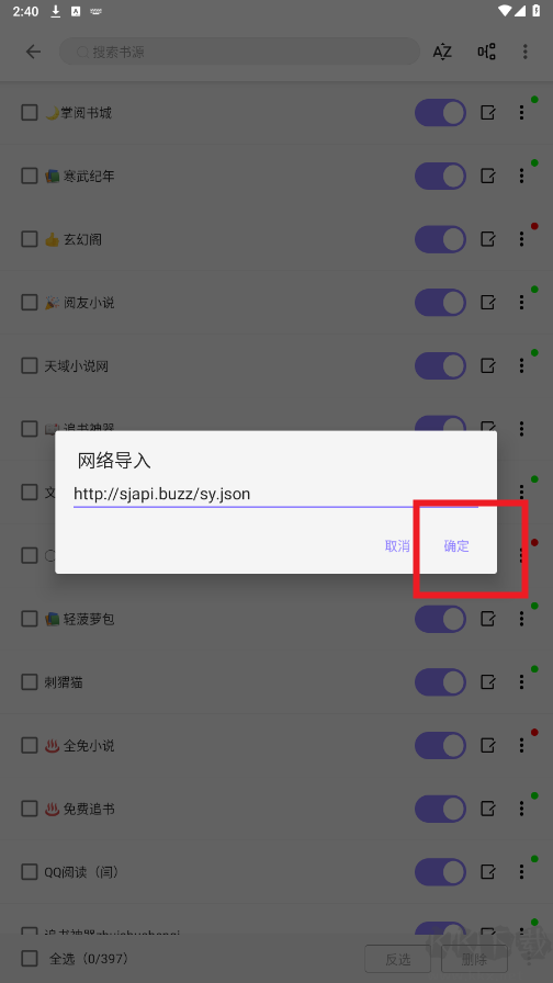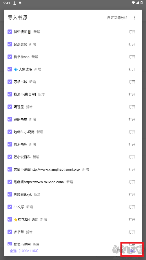 6、勾選需要添加的書(shū)源,確認(rèn)完成導(dǎo)入