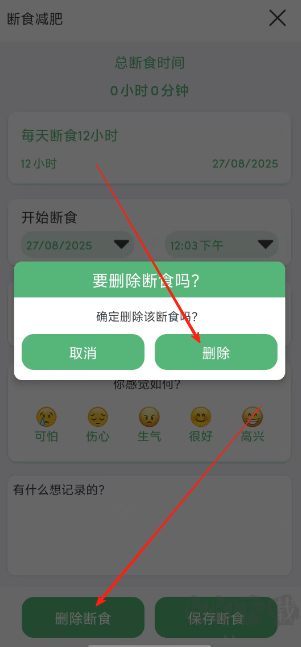 3、在對(duì)應(yīng)頁面中,直接點(diǎn)擊 “刪除斷食”,隨后在彈出的窗口中點(diǎn)擊 “刪除” 即可。