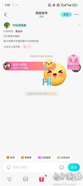 5、匹配成功后會(huì)進(jìn)入聊天界面,這時(shí)候你可以根據(jù)她的愛好進(jìn)行交流慢慢處成對(duì)象