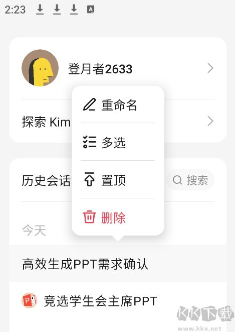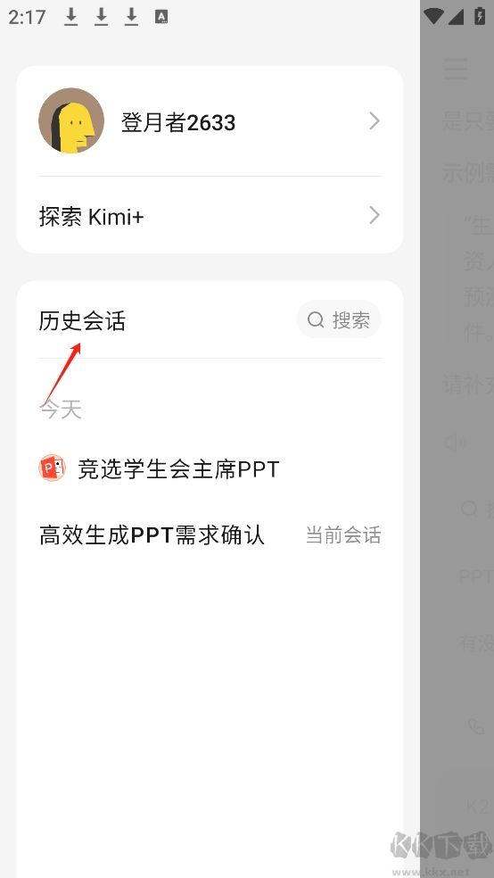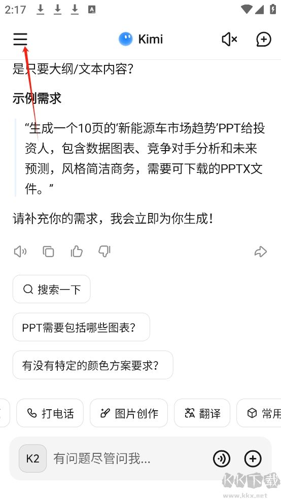 1、打開Kimi智能助手應(yīng)用,點擊主界面左上角的三條橫線圖標(biāo)。