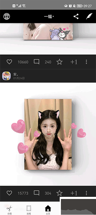 1、首先打開應(yīng)用,進(jìn)入首頁(yè)后能看到許多不熟悉的功能,包含分圖、加框、卡點(diǎn)、拼圖、評(píng)語(yǔ)等多種作用。