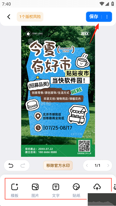 3、選擇模板后,使用底部編輯工具進(jìn)行創(chuàng)作,完成后點(diǎn)擊保存;