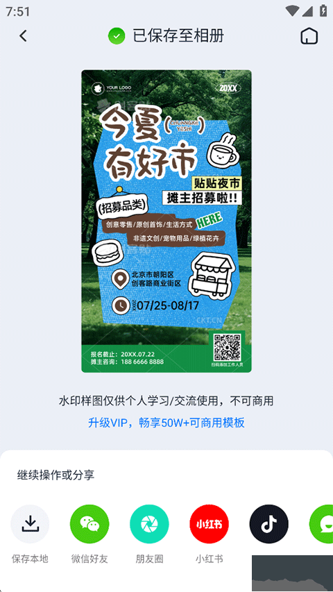 4、作品保存至相冊(cè),并支持一鍵分享至微信、朋友圈、小紅書(shū)、抖音等平臺(tái)。