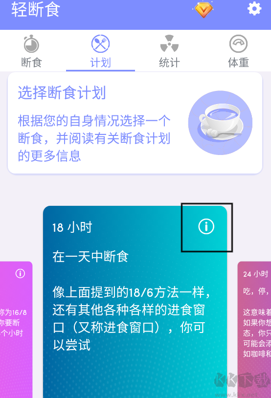 1、進(jìn)入軟件我們首先在計(jì)劃欄選擇一個(gè)適合自己身體情況的斷食計(jì)劃,可以選擇12小時(shí)、16小時(shí)等等其他科學(xué)計(jì)劃,也可以根據(jù)自身情況定做一個(gè)計(jì)劃。點(diǎn)擊各計(jì)劃右上角的感嘆標(biāo),可以看到該斷食計(jì)劃的科學(xué)說法!