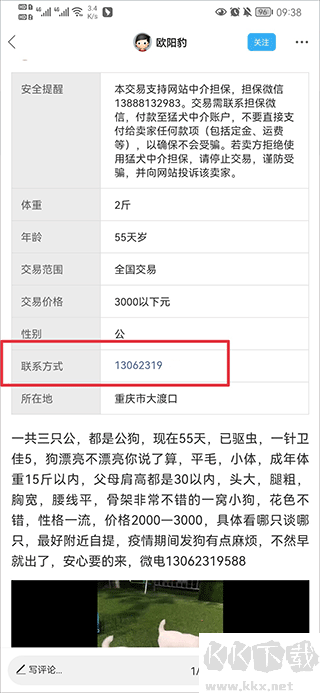 2、點(diǎn)擊進(jìn)入心儀狗狗的帖子后,會(huì)有賣家的聯(lián)系方式,買家使用者能夠通過電話聯(lián)系賣家開展交易。