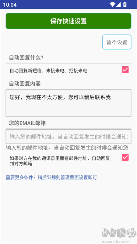 1、自定義信息與來電的自動回復(fù)規(guī)則,回復(fù)途徑涵蓋短信與郵件。