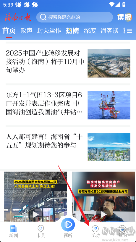 1、打開海南日報APP,在下方導(dǎo)航欄找到并點(diǎn)擊【互動】,進(jìn)入互動中心。