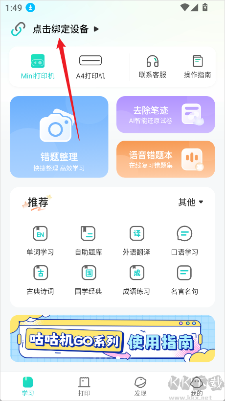 1、打開咕咕機(jī),在首頁找到并點擊綁定設(shè)備入口。