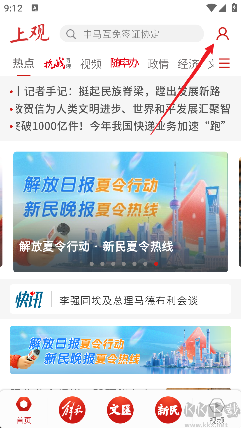 1、進(jìn)入上觀新聞App后點(diǎn)擊右上角的頭像