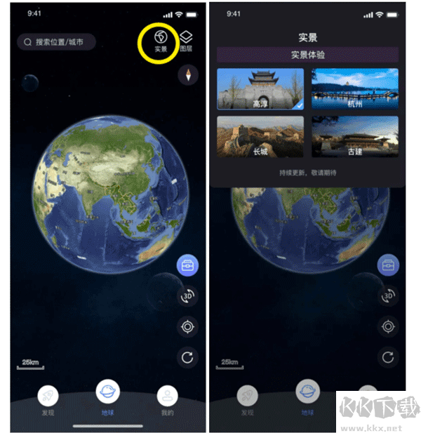 1、首頁地球區(qū)域點(diǎn)擊右上角【實(shí)景】按鍵,彈出實(shí)景選擇界面。