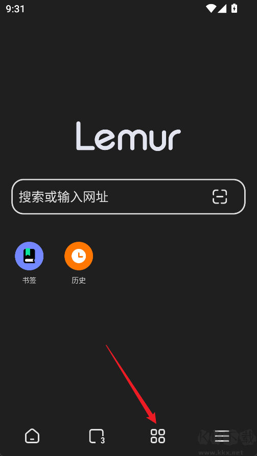 1、進(jìn)入狐猴瀏覽器App后點(diǎn)擊下方方形圖標(biāo)