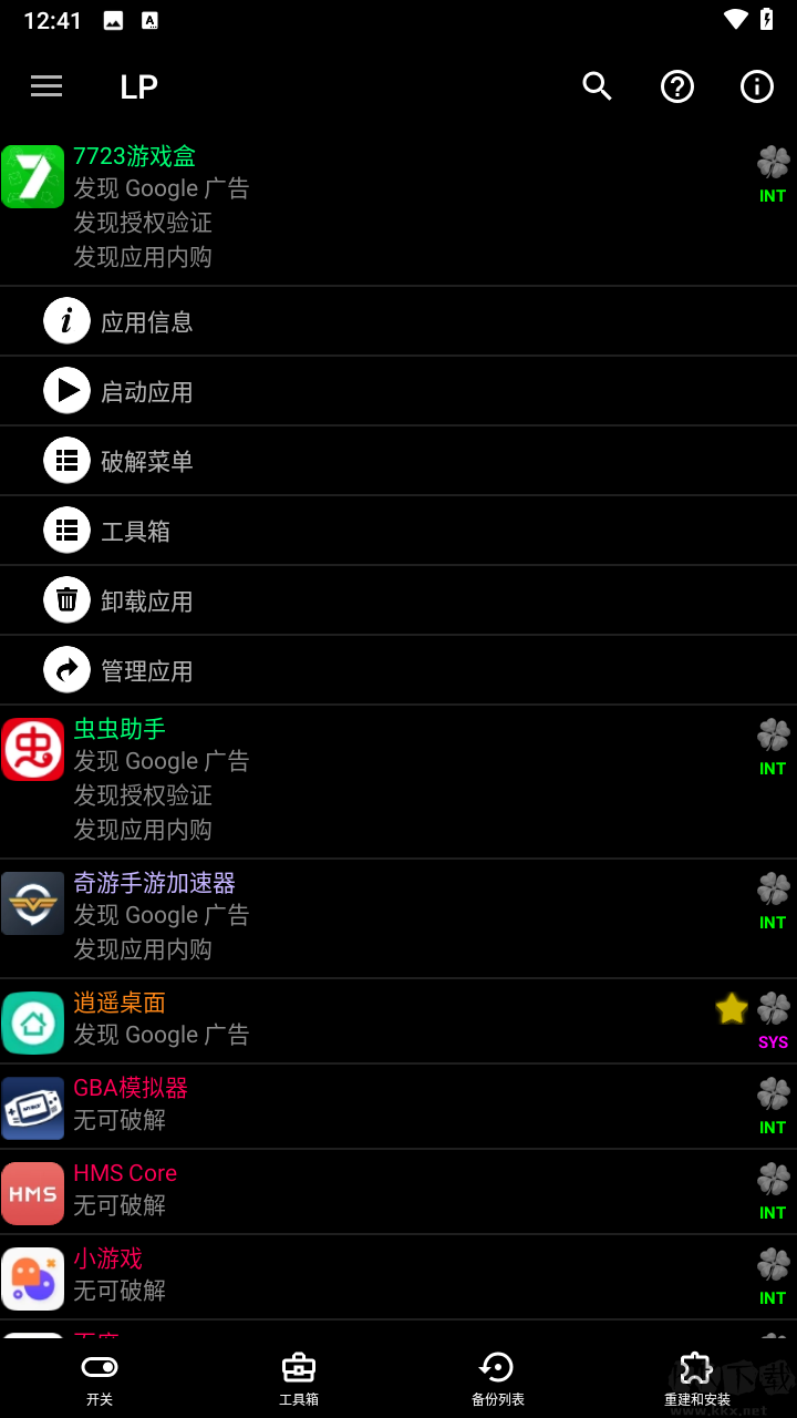 3、長(zhǎng)按軟件選中程序,彈出菜單選破解即可。
