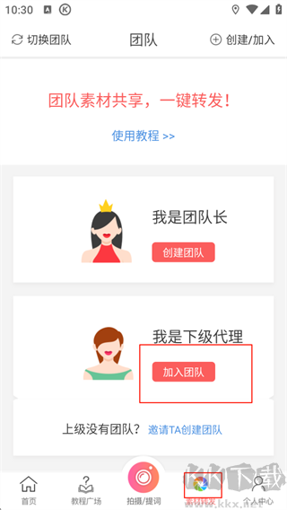 2、進(jìn)入首頁,點(diǎn)擊最下方 【素材轉(zhuǎn)發(fā)】,點(diǎn)擊中間【加入團(tuán)隊】