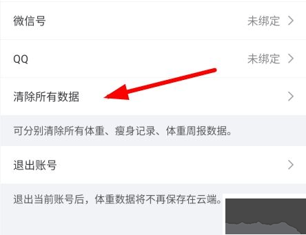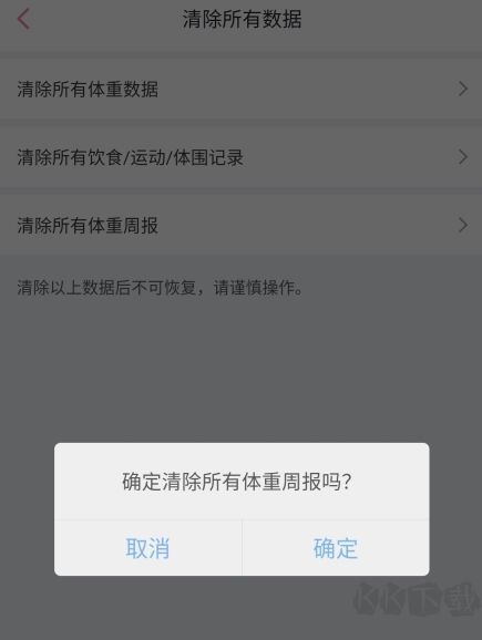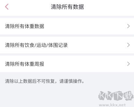 3、在這里可以清除所有體重?cái)?shù)據(jù)、所有飲食/運(yùn)動(dòng)、體圍記錄和清除所有體重周報(bào)。