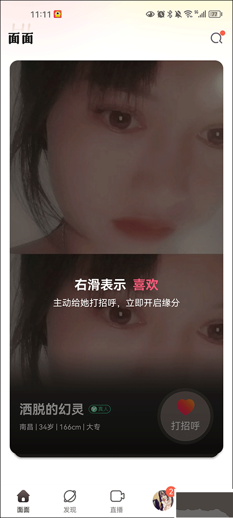 1、在主頁里,你可以向左滑動屏幕來表達對另一位的好感,也能主動向?qū)Ψ絾柡谩?/p>