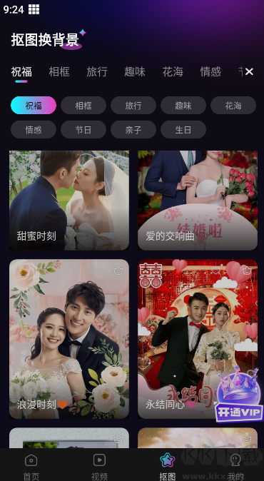 3、摳圖功能中提供不少背景素材與精美相框,你可以用它們?yōu)檎掌b裱,給圖片增添精致感,成為精致酷孩 er。