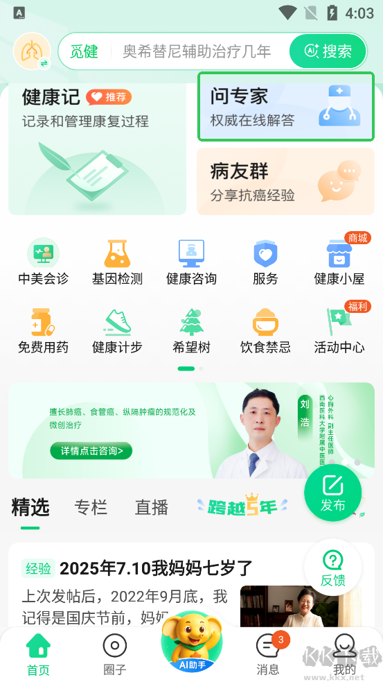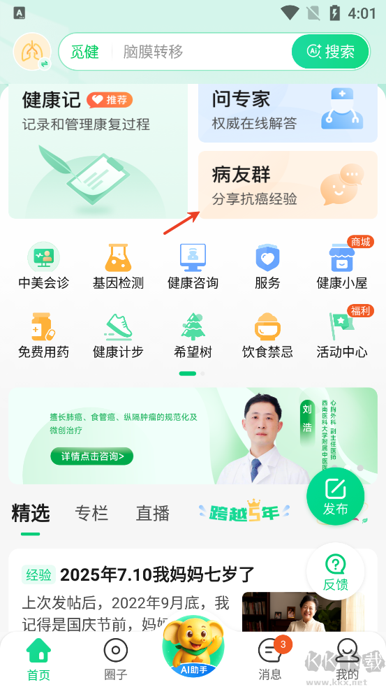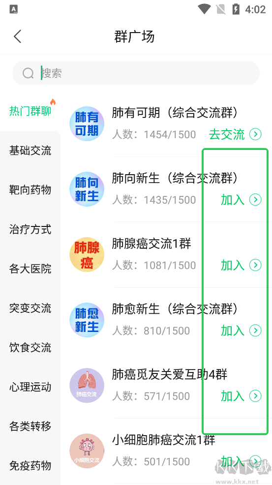 答:在“圈子”頁面搜索您所屬的病種(如肺癌、乳腺癌等),點擊進入后選擇“加入”,即可參與話題討論、查看經(jīng)驗分享。