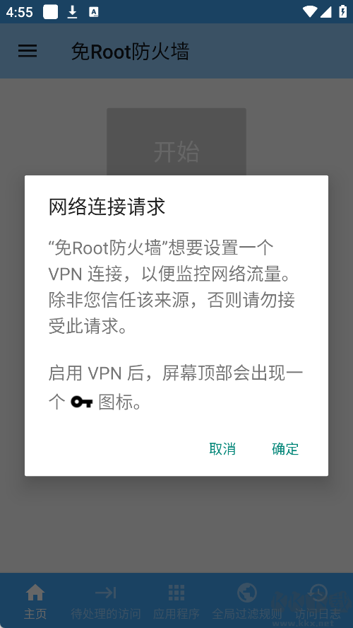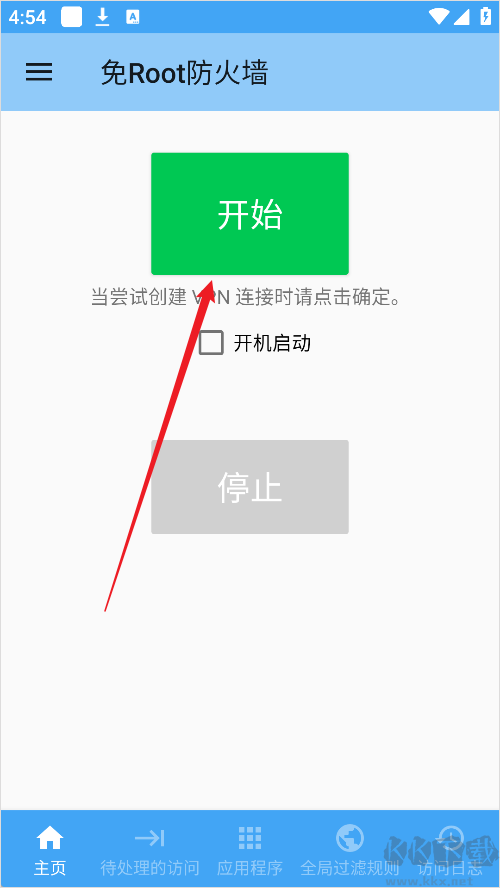 1、打開免root防火墻App后,先點(diǎn)擊主界面的“開始”按鈕進(jìn)入設(shè)置;